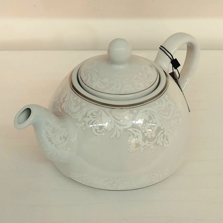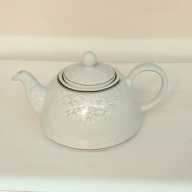 قوری چینی برند معتبر شکس دارای کف پهن جهت دم آوری بهتر چای طراحی زیبا و ارگونومیک درب دو قفل رنگ سفید و نقره ای
