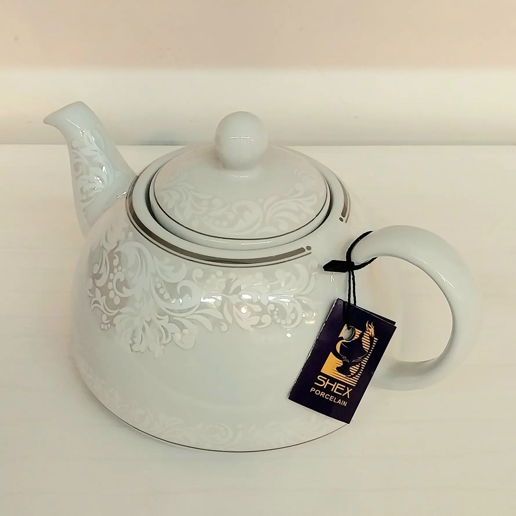 قوری چینی برند معتبر شکس دارای کف پهن جهت دم آوری بهتر چای طراحی زیبا و ارگونومیک درب دو قفل رنگ سفید و نقره ای